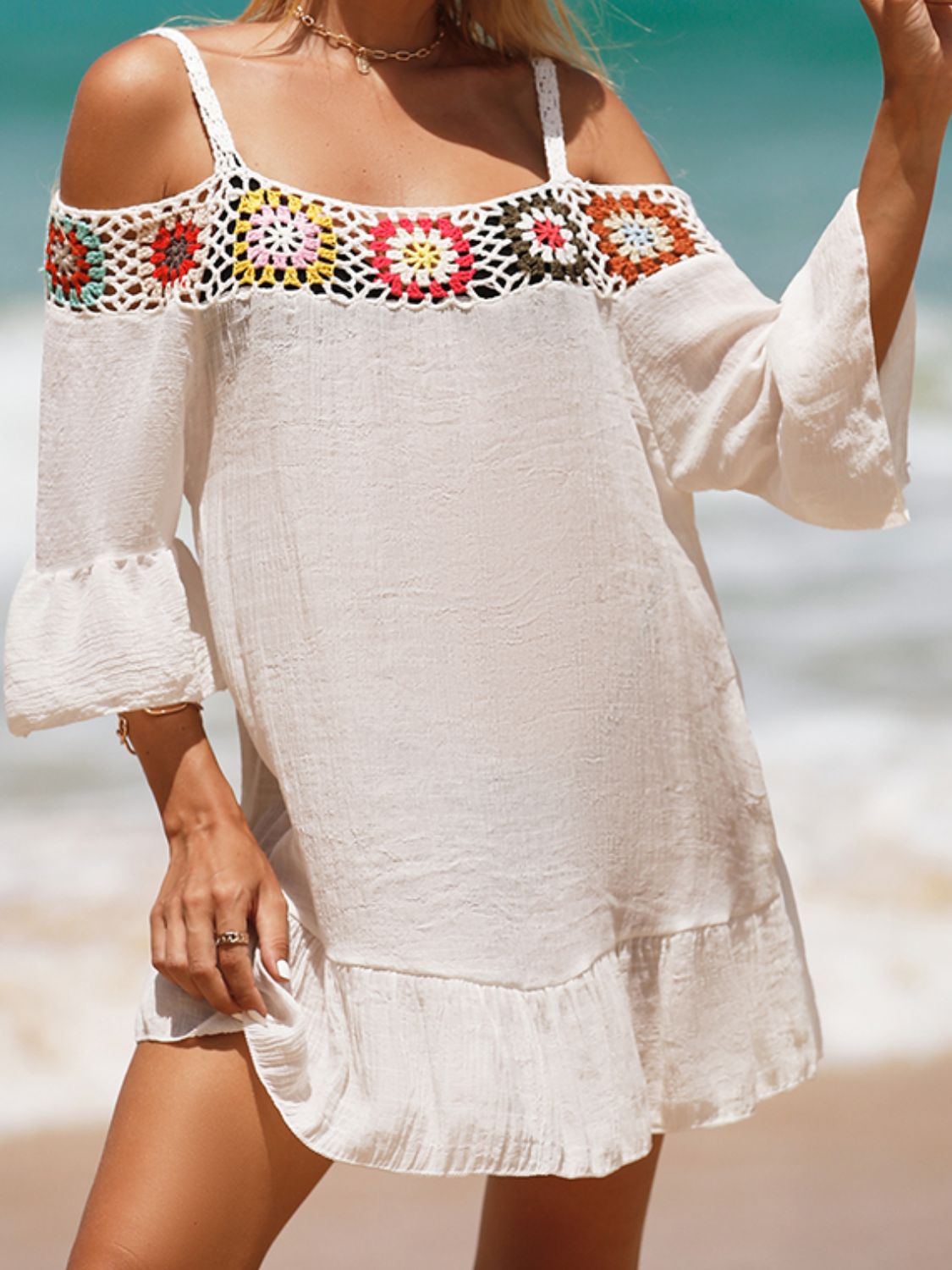 • Crochet Cold Shoulder Three-Quarter Sleeve Cover Up