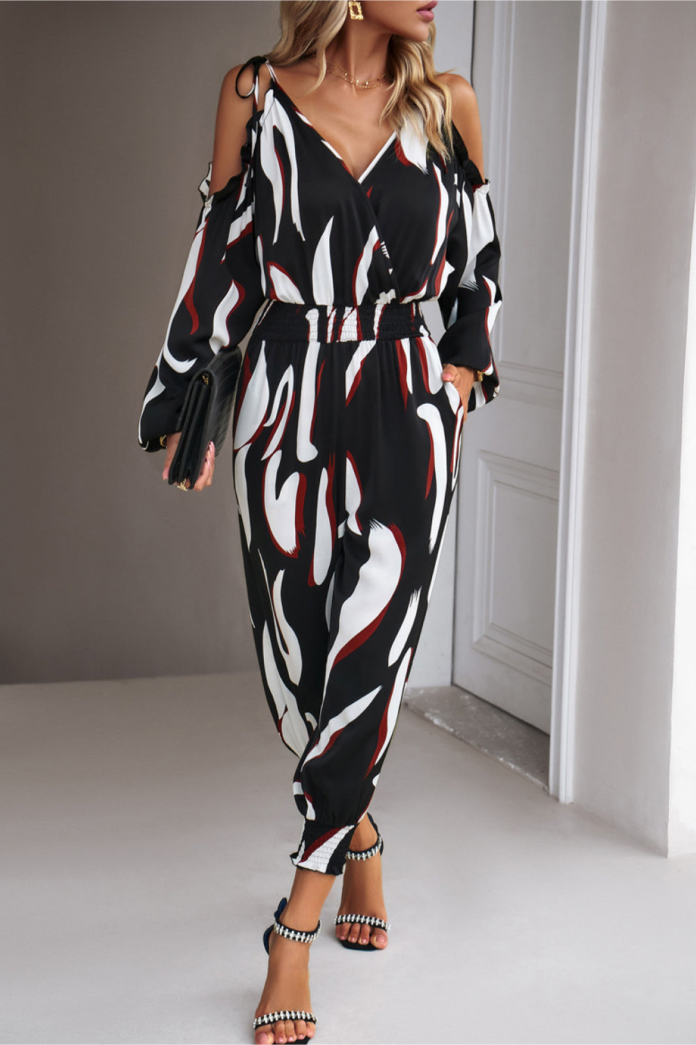 • Printed Cold-Shoulder Surplice Neck Jumpsuit